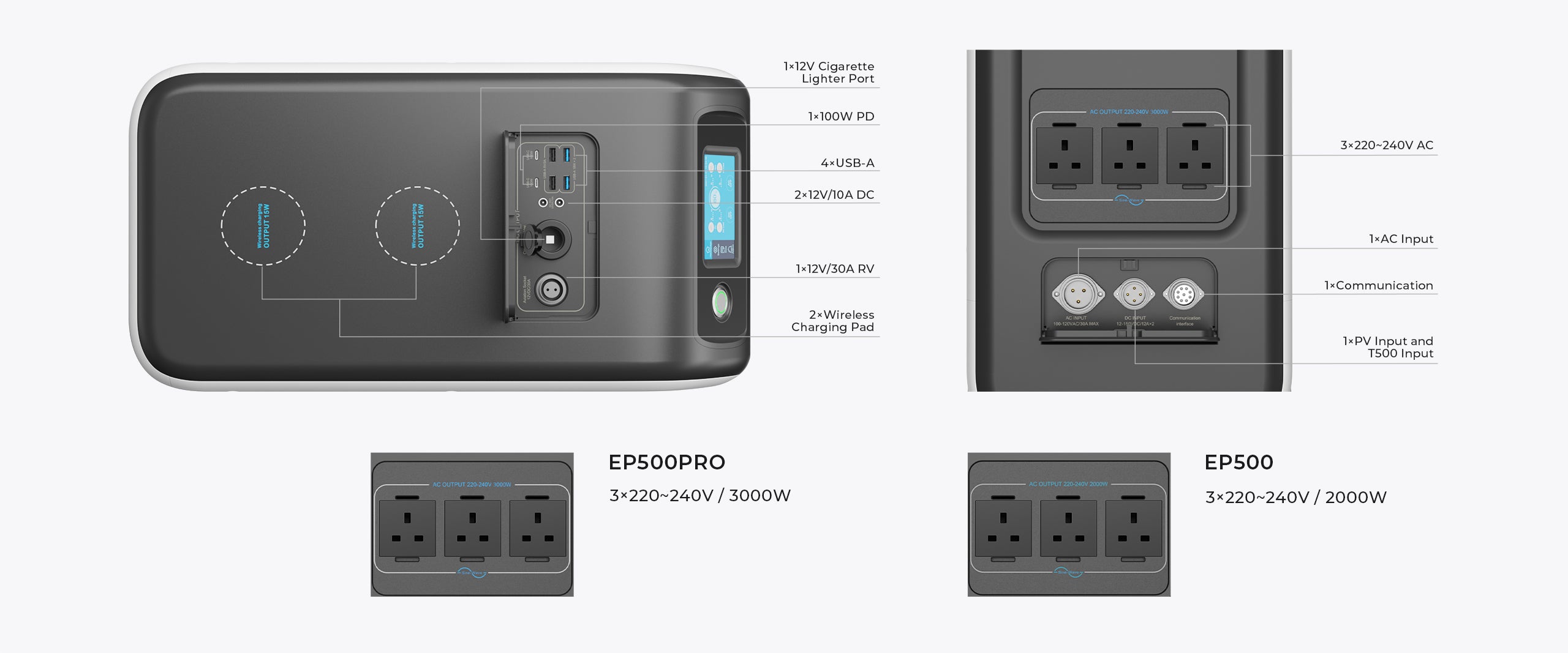 3. AC input: 3000W for EP500Pro, while 600W for EP500.