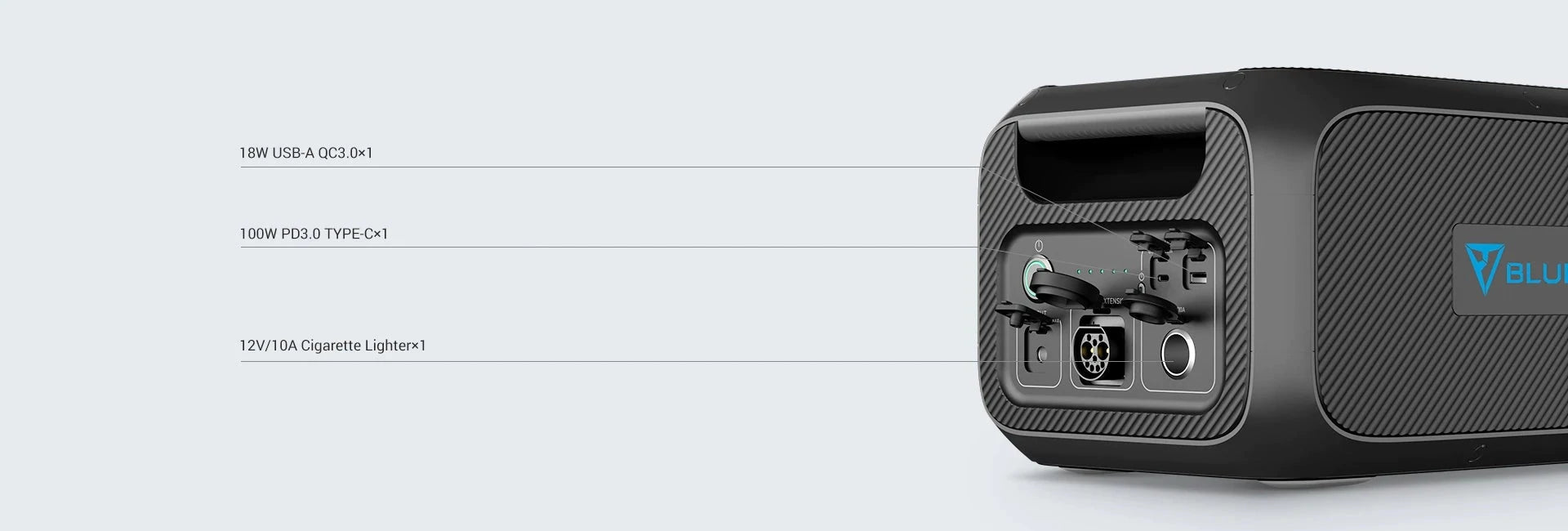 - منفذ USB-C بقوة 100 واط، ومخرج سيارة 12 فولت/10 أمبير ومنافذ USB-A.