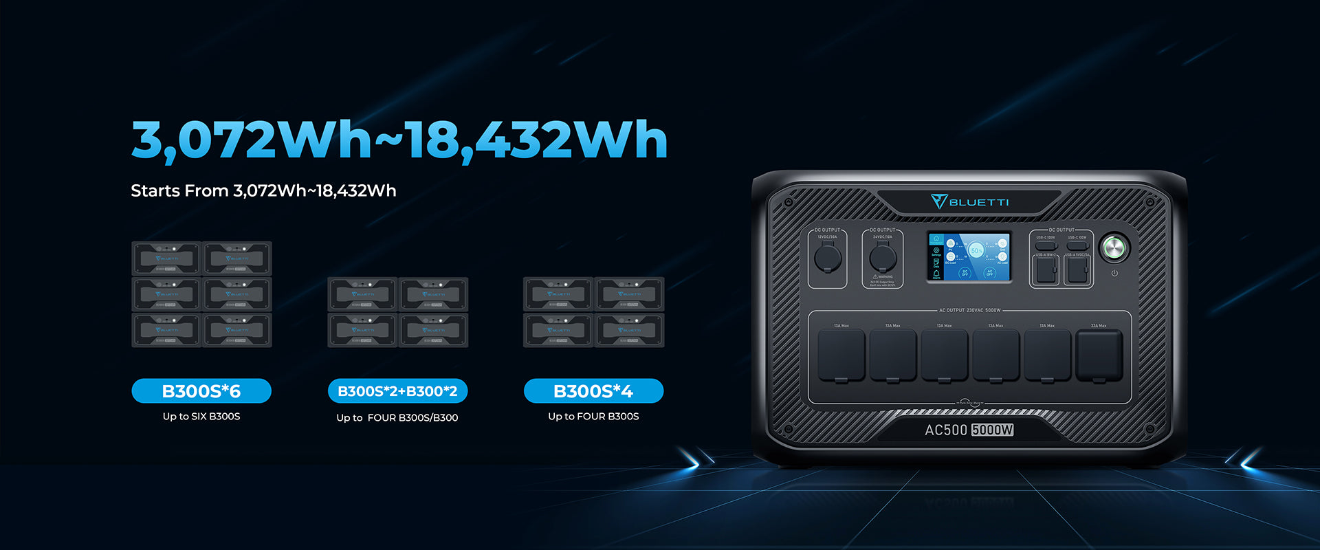 بفضل التصميم المعياري، ترحب AC500 بما يصل إلى 6 × B300S أو 4 × B300 (أو مجموعة من بطاريات B300 وB300S) بسعة إجمالية تبلغ 18,432 وات في الساعة و12,288 وات في الساعة، على التوالي، مما يغطي احتياجاتك من الطاقة خارج الشبكة لأيام !