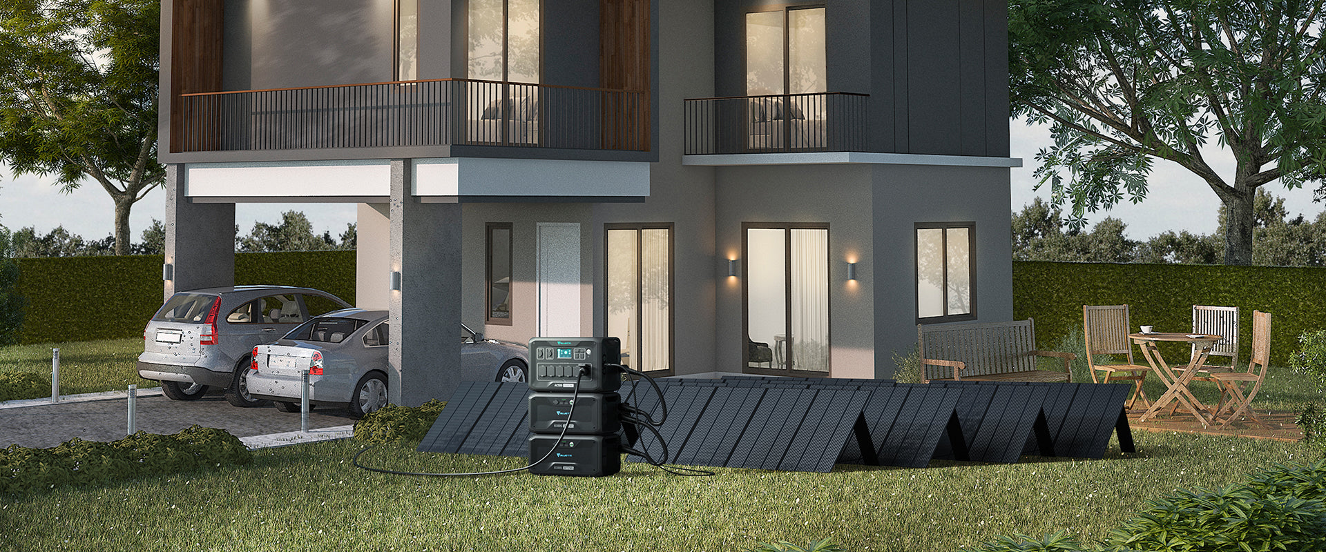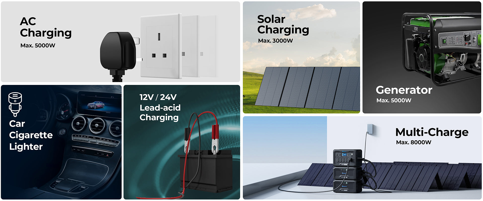 * يتطلب كابل شحن 50 أمبير أو ربطه بالشبكة. * تتطلب حزمتي B300S على الأقل وشحنًا مزدوجًا عبر 3000 واط من الطاقة الشمسية و5000 واط من التيار المتردد. أو سيقتصر معدل الإدخال على 4500 واط مع B300 واحد فقط.