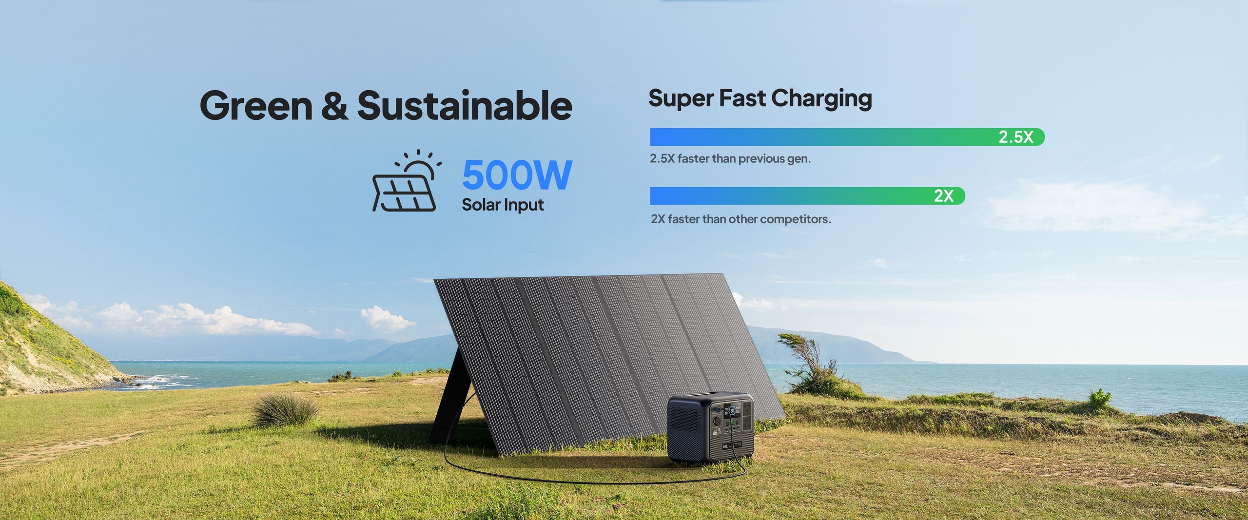 - مدخل طاقة شمسية سريع بقوة 500 واط، شحن كامل في ساعتين