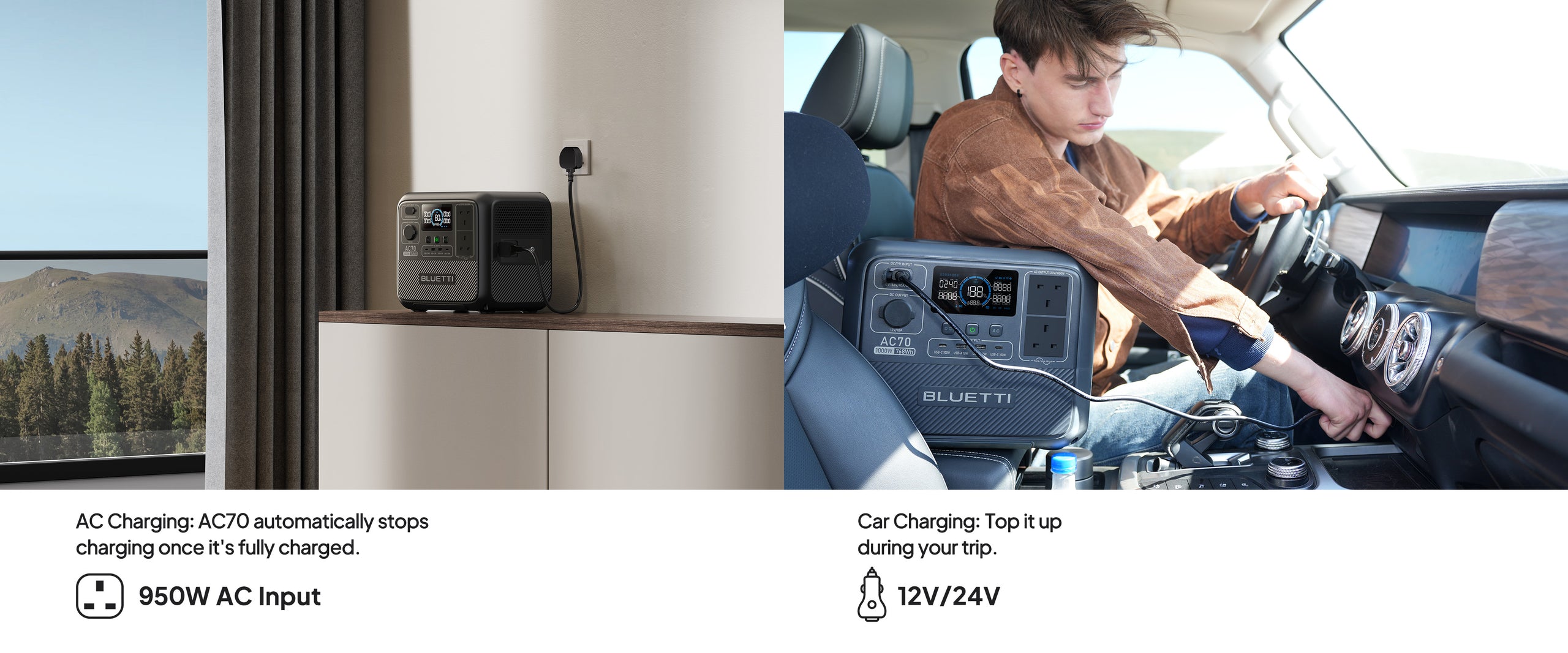 اشحنه بقوة تصل إلى 950 واط مع تقنية الشحن التوربيني، وستكون طاقتك جاهزة قبل انطلاقك. يتوقف شاحن AC70 تلقائيًا عن الشحن لمنع الشحن الزائد. يمكنك حتى شحنه عبر منفذ ولاعة السجائر في سيارتك، مما يضمن لك طاقة كافية أثناء التنقل.