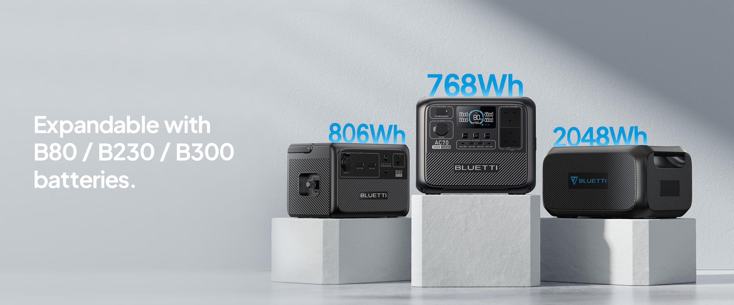 يتوافق AC70 بشكل مثالي مع بطاريات التوسعة B80 (806Wh)، أو B230 (2,048Wh)، أو B300 (3,072Wh)، مما يوفر مصدر طاقة ثابت لاحتياجاتك المتزايدة.